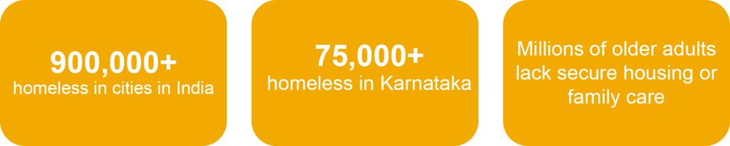 Across India and in Karnataka, growing numbers of older adults and homeless individuals face the twin challenges of social isolation and the absence of safe, secure shelter. Many seniors live alone, without adequate care or community connection, while people experiencing homelessness sleep in unsafe public spaces, exposed to harsh weather, illness, and neglect.